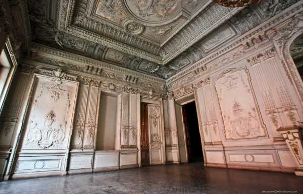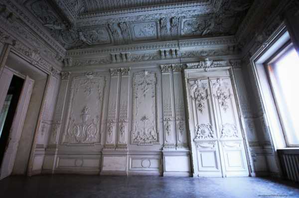 Особой пикантности добавляет тот факт, что каждый шаг в комнатах отдаётся протяжным скрипом половиц на все здание. Ощущение того, что в любую секунду вы можете попасться, заставляет с осторожностью продумывать каждое движение. Анфилада залов, парадная столовая, оранжерея, белый танцевальный зал, кальянная комната, мраморная парадная лестница- почти каждое следующее помещение вызывает не иначе, как «синдром Стендаля». Примечательным фактом является то, что теоретически сюда можно попасть с экскурсиями за определённую плату (да-да, особняк разрушается, реставрации не видно и на горизонте, однако сюда изредка все же ходят люди). Однако мы по нашему графику на экскурсии явно не попадали, поэтому пришлось искать другие пути. Да и вышло так гораздо атмосфернее. Но за все приходится платить. А пока что я предлагаю вам перенестись в 19ый век. Итак, за окном льет дождь… 1. Начинаем с центрального помещения. Белый зал, танцевальный, оформленный в стиле Людовика XV. Нарядное помещение изобилует белой лепниной с позолотой. Под потолком хорошо видна отделка с фигурками амуров и различных музыкальных инструментов.
