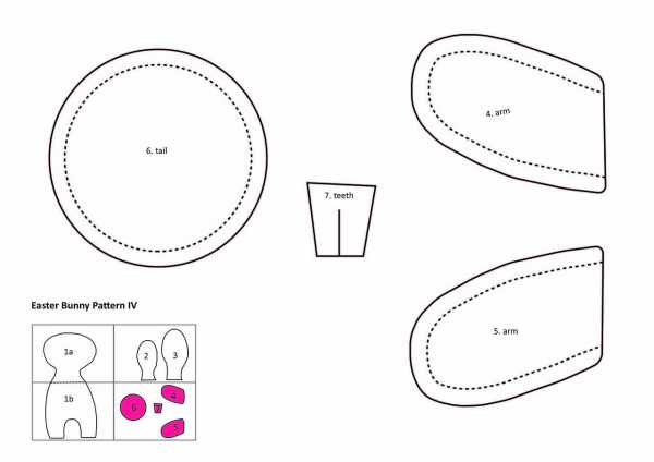 Шаблон включает в себя заготовку для основной части (1), две заготовки ушей (2, 3), две заготовки для рук (4, 5), одна заготовка для хвоста (6) и одна для зубов (7). Сплошные линии обозначают контуры (линии отреза) и пунктирные линии показывают, места сшивания.