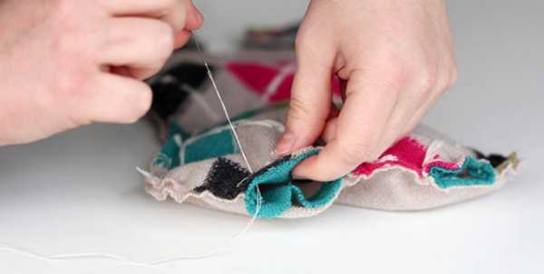 Всовываете в свитер чехол с набивкой и пришиваете снизу вырезанное из плотной ткани дно.