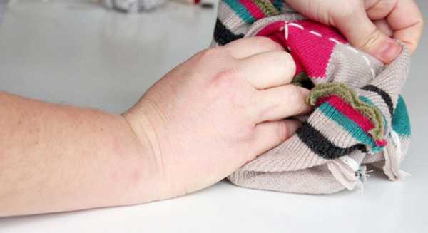 Шьете внутренний чехол и набиваете его холлофайбером или другой набивкой, закрепляете нитью. От свитера отрезаете рукава и сшиваете образовавшиеся дырки изнутри.