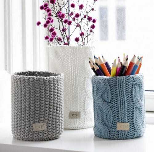 Выкройте из свитера или другой ненужной вязаной вещи отрезок ткани и пошейте для стакана (жестяной банки без крышечки, миниатюрной банки из-под кофе, старой чашки с отбитой ручкой…) теплый чехол – теперь у вас есть милая карандашница.