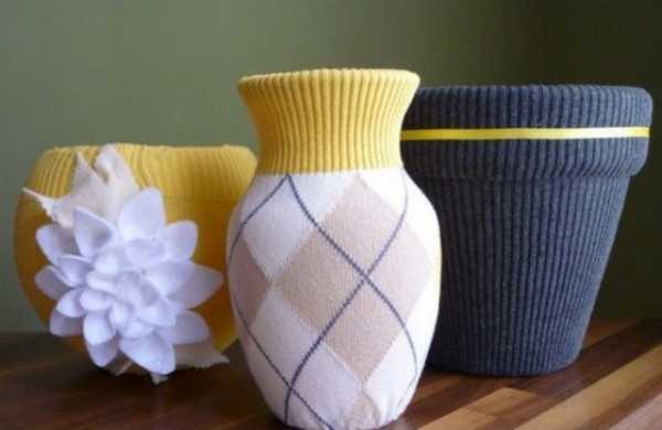 Сделайте зимнюю коллекцию для ваших керамических ваз. Если у вашего старого свитера рукава в приличном состоянии, то можно просто отрезать рукав и декорировать им вазу или бутылку.