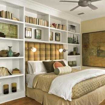 В спальне стеллажом может быть оборудована стена в изголовье кровати. Это практичное решение, позволяющее организовать систему хранения в том месте, которое обычно мало используется. Стеллаж здесь часто имеет П-образную форму, то есть он словно «опоясывает» кровать у стены.
