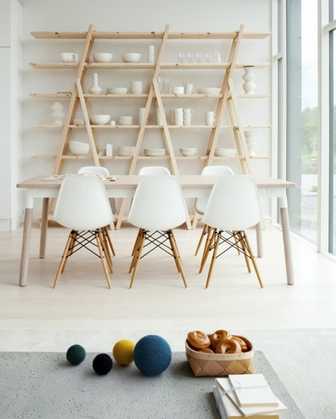 Во-вторых, стеллажи традиционно устанавливаются в обеденной зоне как современная альтернатива старому доброму буфету. На полки выставляют сервизы, а также различные предметы декора.