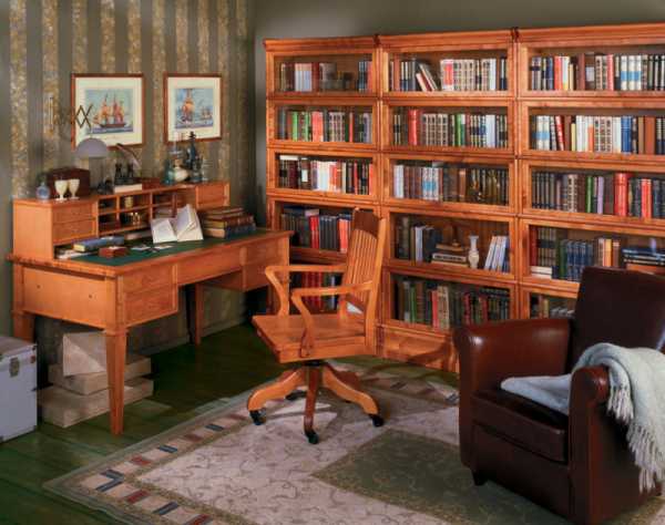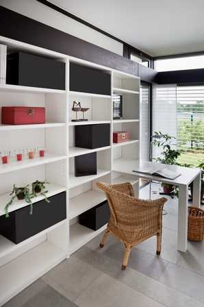 Стеллажи — типичный предмет мебели для офисов. В домашнем кабинете он тоже необходим. Стеллаж стараются располагать сбоку от сидящего за столом — так, чтобы основная часть содержимого была на расстоянии вытянутой руки. Подбирается стеллаж в цвет рабочего стола.