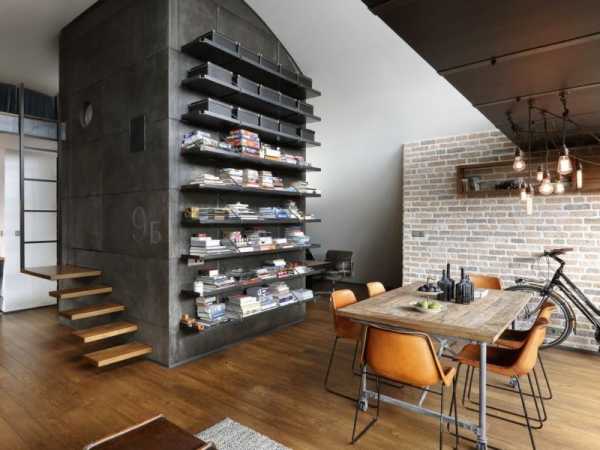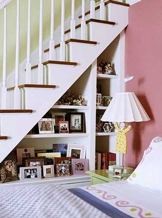 Место под лестницей тоже может быть использовано под стеллаж. Да и лестничное ограждение может представлять собой… да-да, все тот же стеллаж.