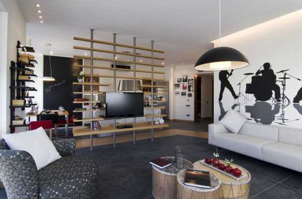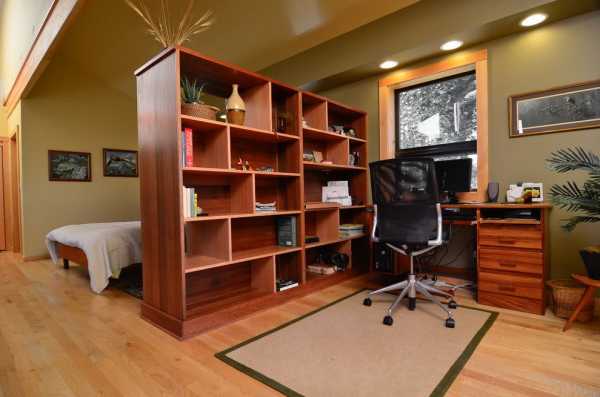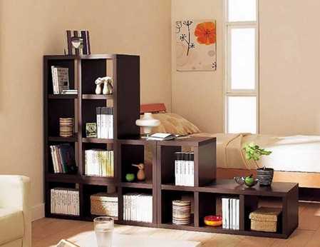 В интерьере комнаты стеллаж чаще всего используют как перегородку – для зонирования помещения. Вот несколько типичных случаев: