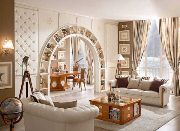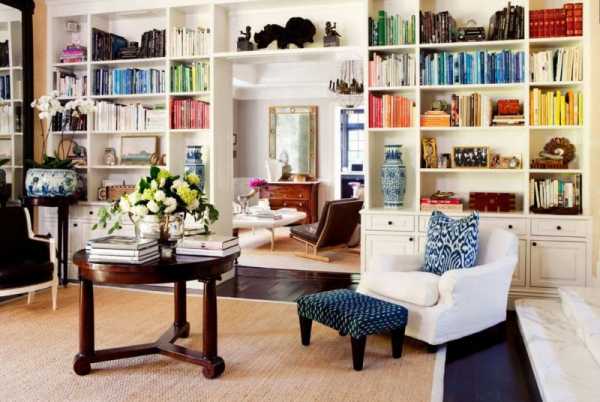 Один из самых удобных и очень популярных методов зонирования пространства при небольших площадях – стеллаж. Это многоярусные полочки, закрепленные вертикальными стойками. Они могут быть во встроенных различных по форме шкафах, но также легко впишутся в библиотеку, гардеробную. Практичны стеллажи в открытом виде на кухне и других помещениях: гостиной, кабинете или детской.
