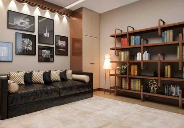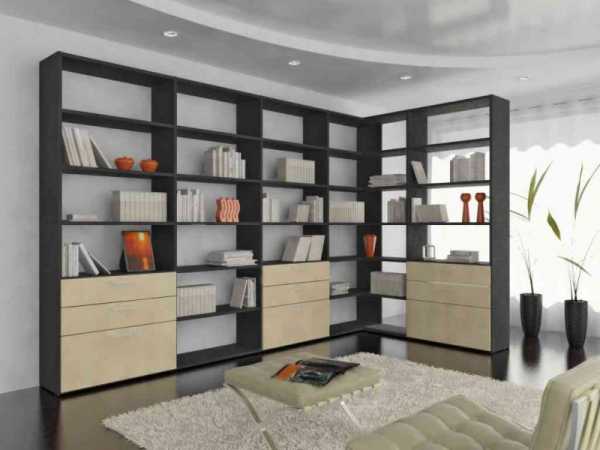 - в гостиной с помощью стеллажа можно отделить зону отдыха или выделить рабочий кабинет(рабочую зону), куда поместить библиотеку и компьютер. В этом случае компьютер с неизбежным количеством проводов, принтером и колонками не будет портить выбранный для гостиной стиль. Кроме того, на стеллаже компактно и доступно можно разместить все, что понадобится для работы – компакт-диски, книги, справочники, бумагу, журналы и прочие принадлежности