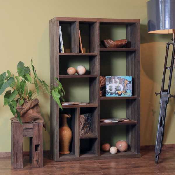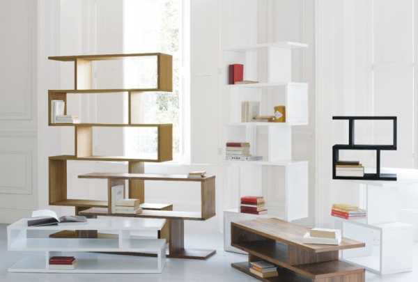 Необычно смотрится асимметричный стеллаж с неправильной формой, разной глубиной полочек и пр.