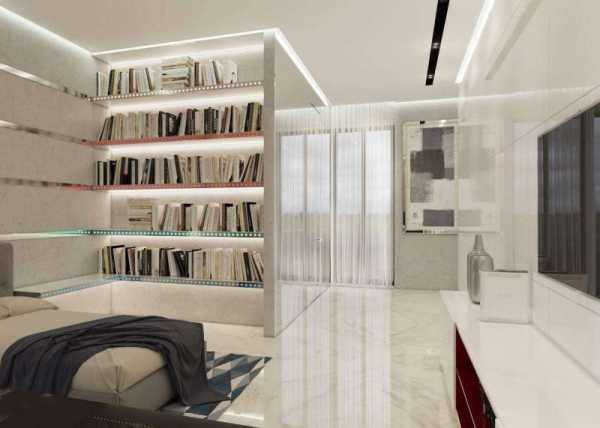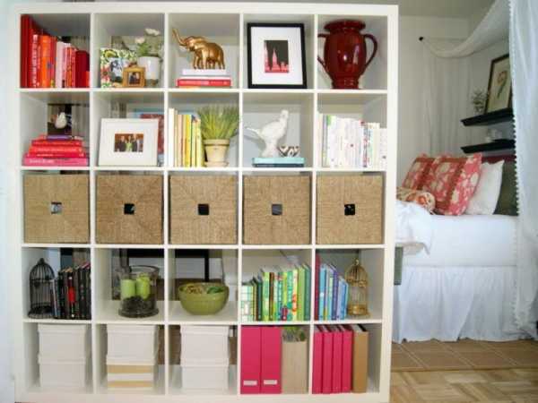- если же в комнате нет особой ниши для кровати, то установка стеллажа решает эту проблему
