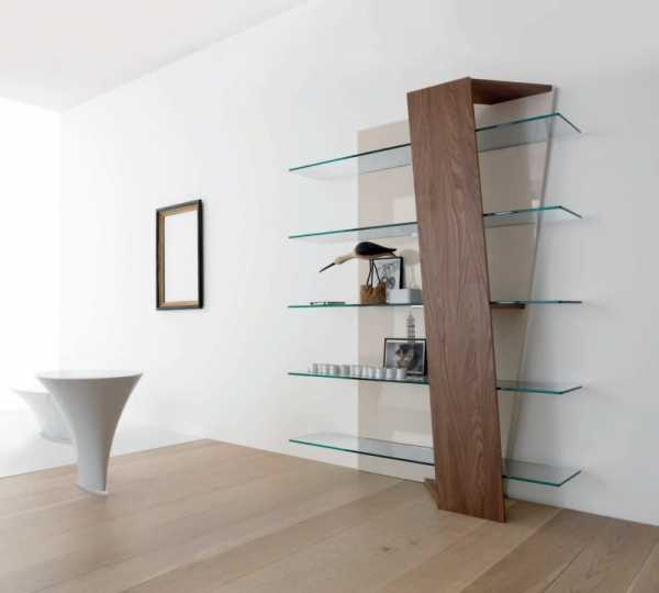 Если ремонт в вашей комнате выполнен в современном или минималистском виде дизайна, в этом случае лучше всего приобрести конструкцию с полками из стекла. Хотя стойки в таком случае изготавливают чаще всего из дерева или делают их металлическими.