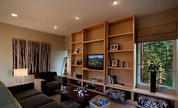Узкие стеллажи в гостиных ставят и за диванами. Чаще всего этот предмет мебели используется под книги и журналы. Очень удобно, не вставая с дивана, выбирать себе чтение.