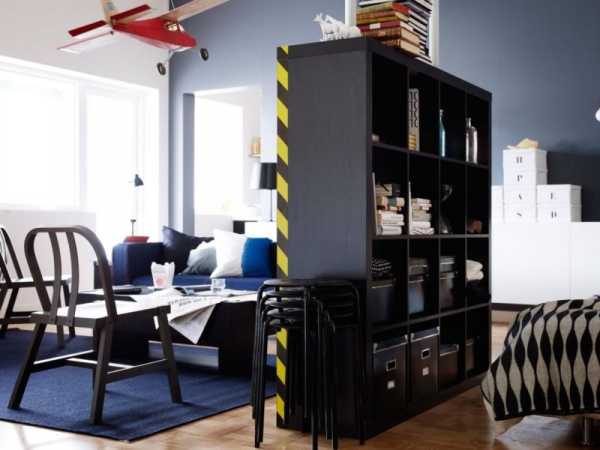 - однокомнатная квартира семьи с ребенком – стеллаж поможет разделить комнату на «родительскую» и «детскую». Дети получают хоть и совсем крошечное, но собственное пространство, что очень важно для воспитания ответственности и самостоятельности. Сквозной стеллаж, разделяющий комнату на «детскую» и «взрослую» половину имеет и еще одно преимущество – родители имеют возможность зрительно контролировать детей, при этом не «вторгаясь» на их территорию. Для такого случая хорошо подойдет двухсторонний стеллаж – с одной стороны можно разместить детские вещи, с другой – вещи родителей
