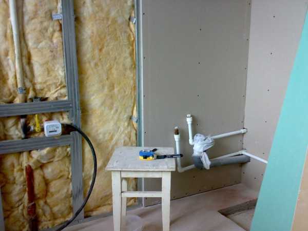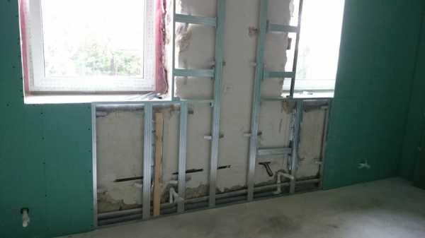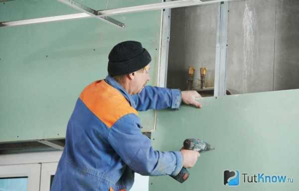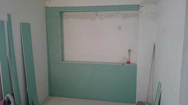 Как только подготовлен каркас из направляющих и стоечных профилей, можно начинать оформление стенки листами ГКЛ.