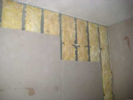 Затем выполняется звукоизоляция и теплоизоляция. Для этого пространство внутри каркаса заполняется минеральной ватой. Рекомендуется использовать этот материал в виде рулона. Так его легче равномерно распределять по всей площади стены. Вата укладывается плотно без свободных пространств между вертикальными стойками каркаса.