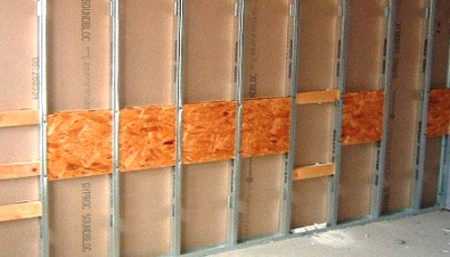 Если конструкция каркаса недостаточно прочная, то следует установить одну или несколько поперечных перемычек из направляющего профиля. Для упрочнения каркаса (при необходимости) можно использовать промежуточные деревянные брусья, которые могут закрепляться и вертикально, и горизонтально.