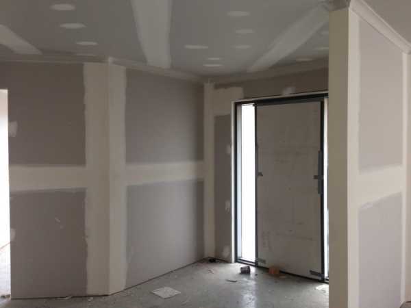 Швы грунтуют, накладывают ленту и выравнивают шпатлёвкой. В итоге должна получиться сплошная ровная поверхность.