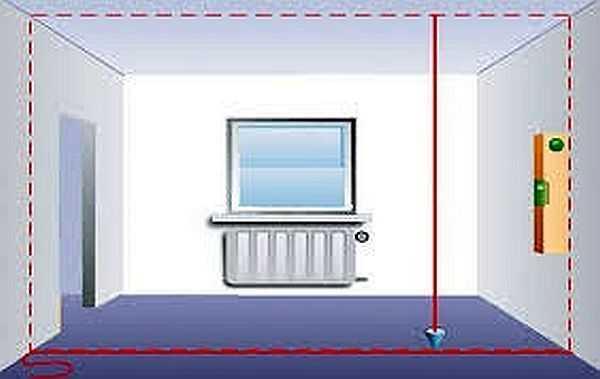 Разметка устанавливаемой стены начинается с боковых стен помещения. От стены с окном отмеряется нужное расстояние и отмечается внизу на стене. Через отметку перпендикулярно полу проводится линия по боковой стене до потолка. Аналогично наносится разметка на противоположной боковой стене. Линии соединяются разметкой по потолку и полу. Эта линия будет являться внутренней границей устанавливаемой стены.