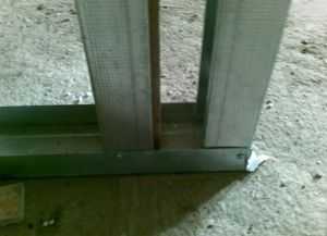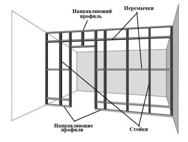 Дверной проем формируется стоечными профилями. Для этого крепятся две вертикальные стойки из этого профиля от пола до потолка, а на нужной высоте на них закрепляется горизонтально перемычка из такого же материала. Если в будущем не предусмотрена дверная коробка, то профили, формирующие дверной проем, следует укрепить деревянным бруском, который закрепляется внутри профиля шурупами. Ширина бруса соответствует ширине профиля.