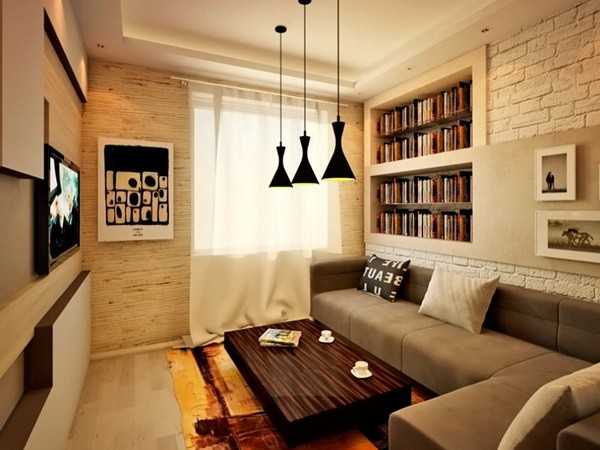 - Если гостиная длинная и узкая, то от использования камня в отделке лучше отказаться. Комната будет выглядеть мрачно и некрасиво. Здесь даже дополнительные источники света не помогут скорректировать помещение.
