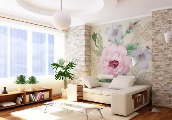 - Совместно с декоративным камнем используйте в гостиной живые цветы. Среда обитания камня – дикая природа. Здесь же много растений. Поэтому обязательно сочетайте в гостиной эти два элемента.