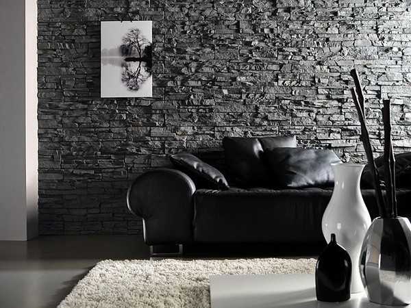 Черный искусственный камень на стене – отличное решение для оформления стильных и современных гостиных.