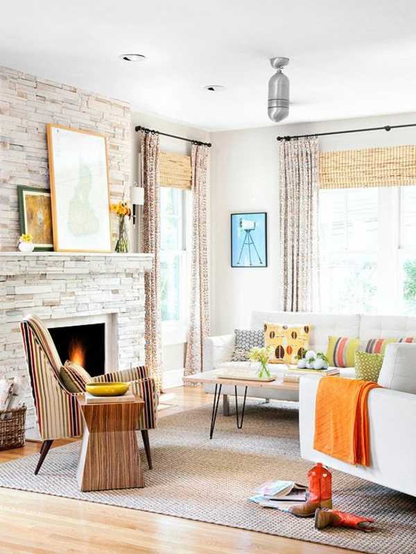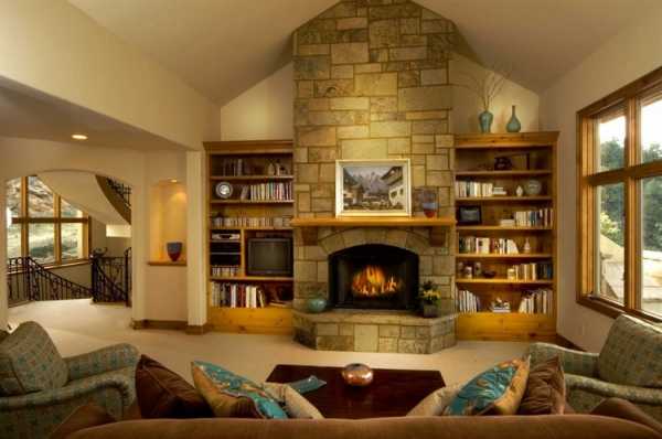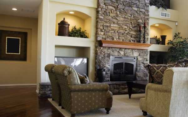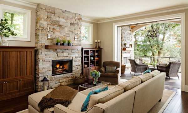 Декоративный камень в интерьере гостиной деревенского стиляЧто можно декорировать камнем в гостиной