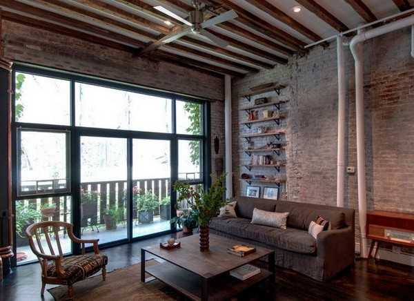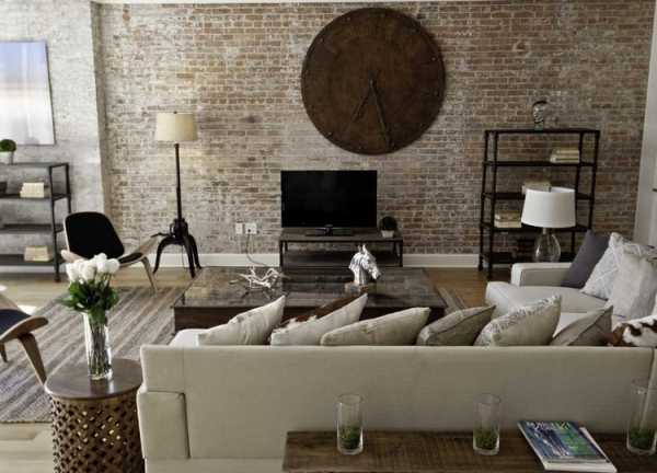 Гостиную стиля Лофт невозможно представить без кирпичной кладки, которая тоже может быть выполнена с помощью декоративного камня.