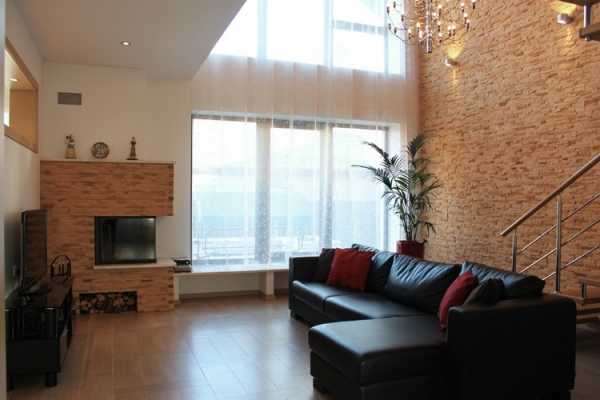 - Если вы счастливый обладатель гостиной большого размера, то занять свободное место можно колоннами, которые должны быть задекорированы искусственным камнем. Эти колонны могут быть как отдельно стоящие, так, и расположены в углах комнаты.