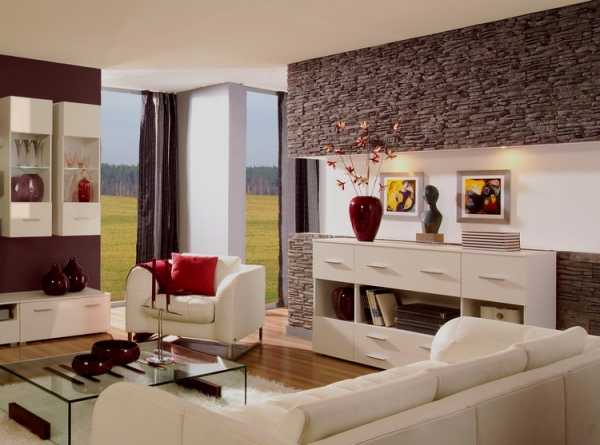 - Камнем можно декорировать только углы в гостиной. При этом должен просматриваться хаотичный порядок укладки.