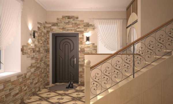 Свободную стену возле двери и саму дверь также можно задекорировать искусственным камнем. Сейчас модно делать в дверных проемах арки, которые облицовывают камнем. Получается оригинальный и средневековый элемент в квартире.