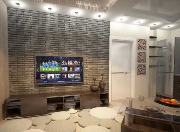- Каждая гостиная нуждается в главном и центральном элементе. В частных домах это может быть камин. Если его нет, то центром может стать телевизор. Ту стену, на которой он висит, задекорируйте камнем. Этот дуэт будет смотреться оригинально и красиво. По бокам от телевизора модно повесить несколько небольших полок в тон камню. На них можно разместить различные аксессуары и диски.