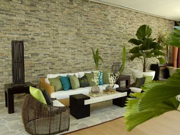 Если речь идет о большой гостиной частного дома, то можно организовать в этом помещении настоящий сад. Такая отделанная комната позволит насладиться уютом, сняв при этом стресс. Отделка стен камнем может выполняться не только в гостиной, но и в других помещениях. Это могут быть коридоры, столовая, кухня, холл, кабинет. Подобное оформление позволит облагородить интерьер, избавив от необходимости устраивать ремонты слишком часто.