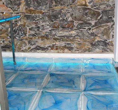 Ну, отзывы об стеклоблоках в интерьере квартиры таковы, что их применение ограничивается только полетом вашей фантазии, а свойства стеклянных кубиков настолько потрясающи, что выдерживают даже нагрузки от ходьбы или танцев. А светопроницаемость позволяет эффектно подсветить их изнутри — посмотрите на фото: перед вами пол из матово–голубых стеклоблоков с светодиодной подсветкой по плинтусу.
