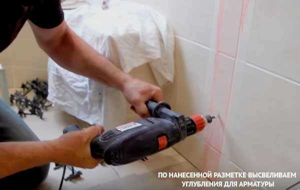 Вертикально устанавливают два стержня, один ближе к наружным сторонам стеклоблоков, второй – к внутренним. Горизонтальные стержни, их тоже два, укладывают внутри «каркаса», рядом с вертикальными. Вертикальные прутья не будут видны, поскольку при кладке используются монтажные крестики. Точно выстроить все горизонтальные и вертикальные швы и выдержать их толщину, применяя крестики, намного проще.
