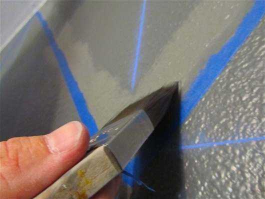 Шаг 4: Все ленты приклеены, но не спешите красить валиком. Для начала нужно покрасить края ленты с помощью небольшой кисточки. Это очень важно, потому что если этого не сделать краска может просочится под края ленты и границы нашего узора не будут ровными.