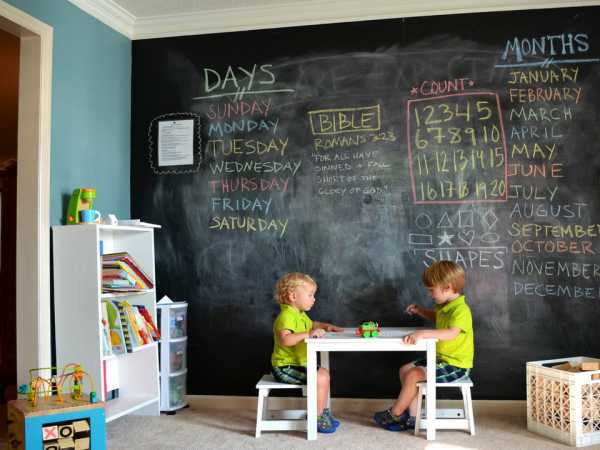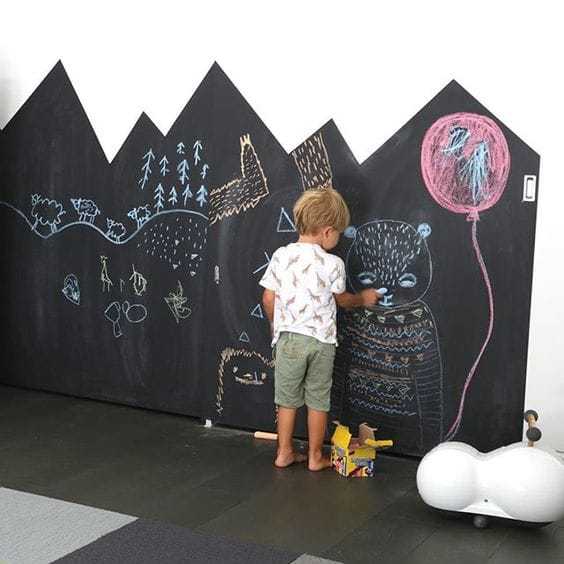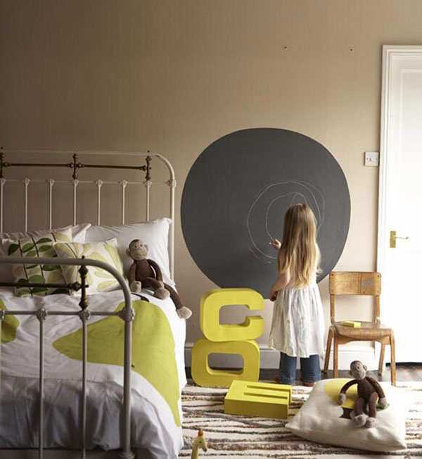 В детской комнате обычно под грифельную поверхность выделяют целую стену. Благодаря этому у ребенка есть возможность писать и рисовать все что угодно. Также можно окрасить еще комод, шкафы. Ребенку это точно понравится.
