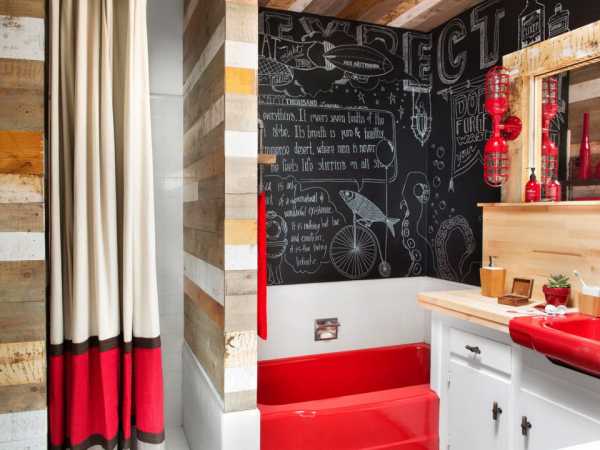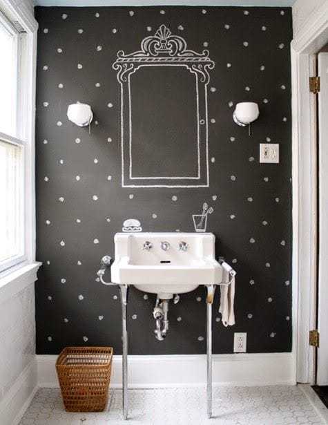 В ванной тоже можно сделать такую стену, так как сама краска не боится влаги. Кстати, можно заменить такой краской дорогие обои и плитку. А если сделать различные записи и рисунки на стенах, то получится уникальный декор.