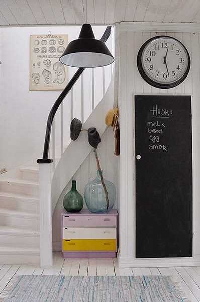 Второе, что смущает – обилие большого количества черного цвета. К выбору окрашиваемой поверхности стоит подойти очень осторожно. Хорошо сочетать с белыми контрастными стенами, особенно идеален в Скандинавском стиле. В бело-черном дуэте можете не переживать за перегруженность и утяжеление, что способствует уменьшению помещения. Белый прекрасно облегчает темный. Если в интерьере преобладают активные цвета, то стоит подумать о частичной грифельной покраске. Например, холодильник, кусочек в прихожей или повесить только доску для рисования мелом.