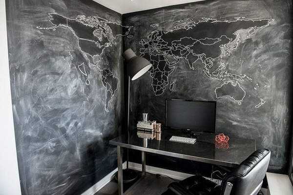 Грифельная краска в кухне пригодится для декора фартука. Стена в столовой увлечет капризного ребенка во время еды. Грифельная стена в прихожей удобна с практичной стороны – записки, послания и списки покупок на выходе и входе в квартиру не останутся незамеченными. Располагая стену в прихожей, рассчитайте так, чтобы гардеробная часть с ней не соприкасалась, иначе одежда будет испачкана меловой пылью. Грифельная стена в кабинете, мастерской или офисе – необходимый атрибут любого творческого или занятого человека. Эскизы, наброски, напоминания о встречах – стена заменит вам органайзер и записную книжку.