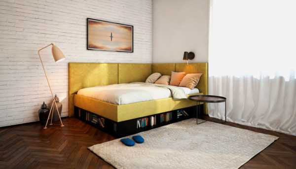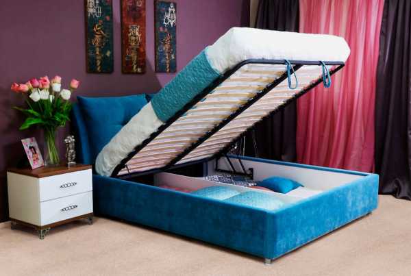 Эффективное использование пространства комнаты можно организовать добавив к кровати подъемный механизм, который осуществит доступ к нише для белья.