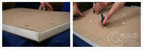 По всей поверхности листа проделываются отверстия в тех местах, где будут установлены пуговицы и будет прижиматься ткань. Можно сформировать любой рисунок расположения пуговиц. Классическим вариантом будет шахматный порядок. Однако можно его и разнообразить, распределив пуговицы и с разной равномерностью изменяя расстояние между ними, например, снизу вверх.