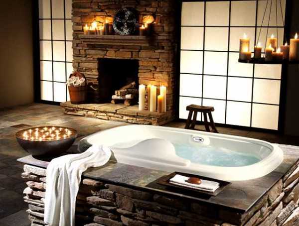 Посмотрите на необычное сочетание современного варианта джакузи с каменной кладкой в японском стилизованном интерьере.