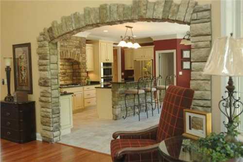 - возможность гармонично вписать камень в дизайн помещения множество. Он отлично сочетается и с коваными изделиями, и со штукатуркой, и с деревом, и с фото обоями, поэтому вписывается в любой интерьер. Камнем можно акцентировать определенные участки: арки, колонны, дверные проемы, ниши, отдельные стены, камины, изголовье кровати, фото родных и так далее, но отделывать камнем полностью все стены – не лучшая идея. В этом случае довольно просто сделать не современное помещение, а холодную крепость.