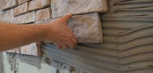 После высыхания грунтовки приступают к поклейке каменных плиток. Стены и камень смазывают клеем или раствором (довольно густо). С этой целью используется обычный плиточный клей. Камень прижимают к стене и держат, пока он не сцепится со стеной. Укладку осуществляют разными способами: