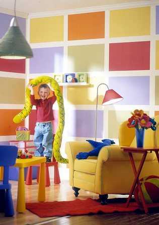 Такой вариант покраски стен применяется в интерьерах современного стиля или модерн. Сочетание ярких геометрических фигур дает интересный эффект. Стены, выкрашенные таким образом, придают интерьеру современность и могут скорректировать пространство.