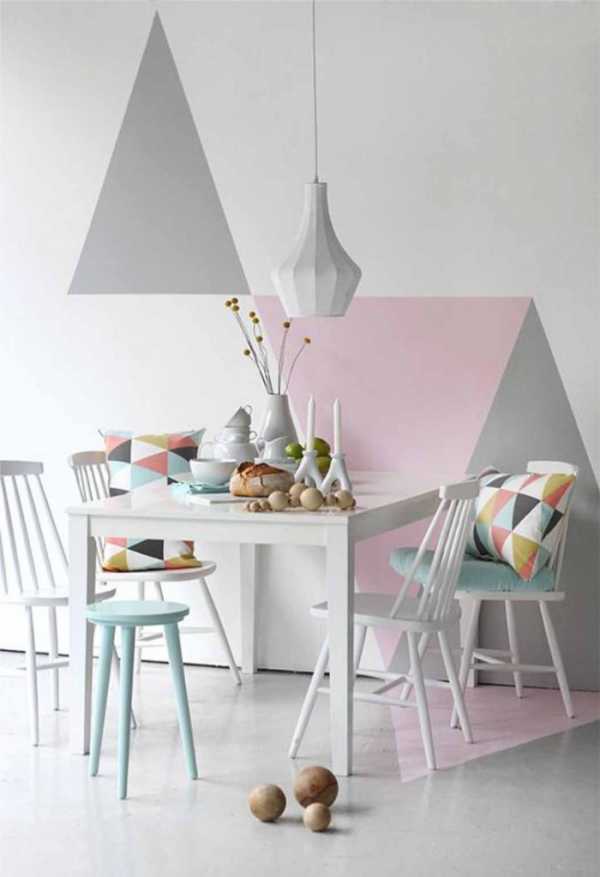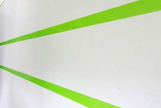 Достигается такой прием при помощи обычного малярного скотча. Его выкладывают в определенные фигуры и закрашивают разноцветными красками. Затем скотч удаляют. На стене остаются ровные геометрические рисунки.