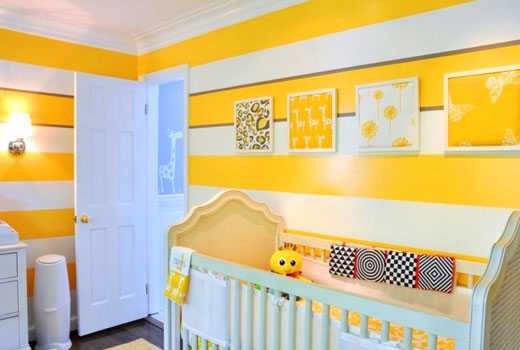 Ярко-желтые полосы на стенах детской — светло и солнечно.