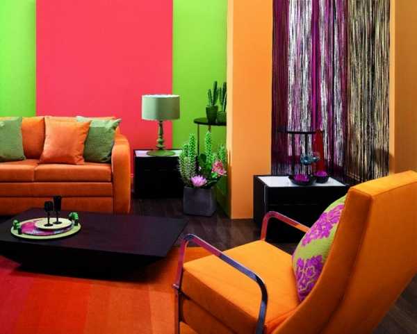Интерьер разноцветной гостинойОбзор цветовой гаммы для ярких стен в интерьере